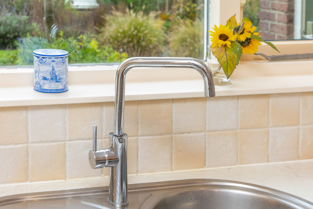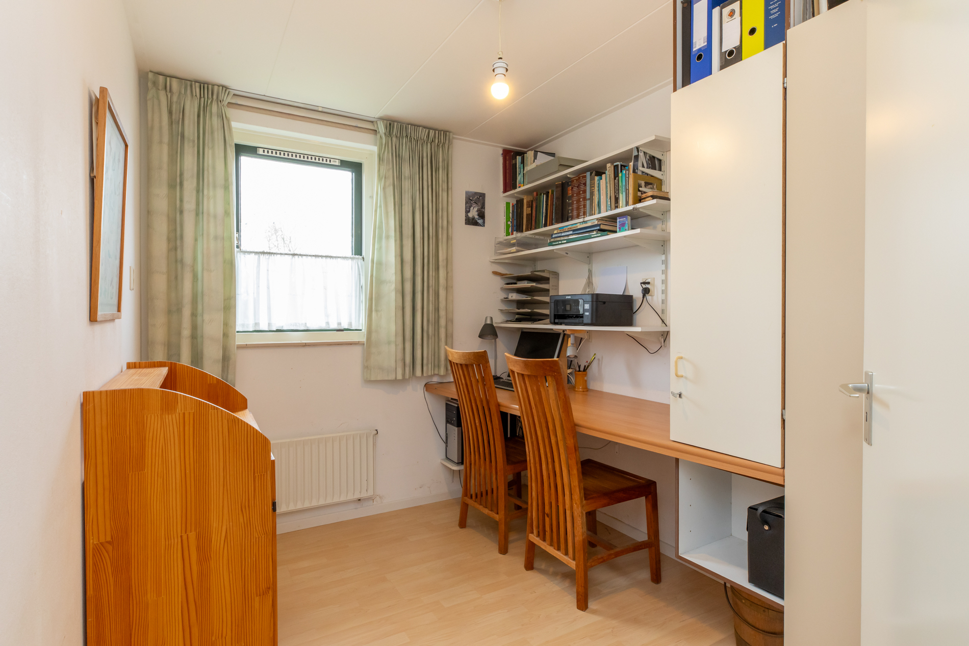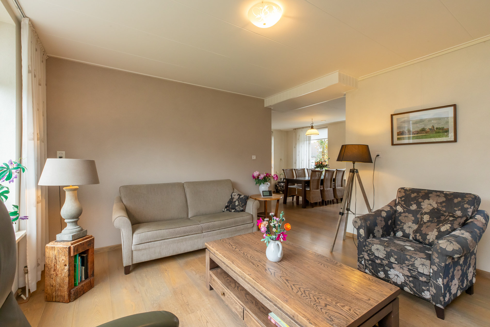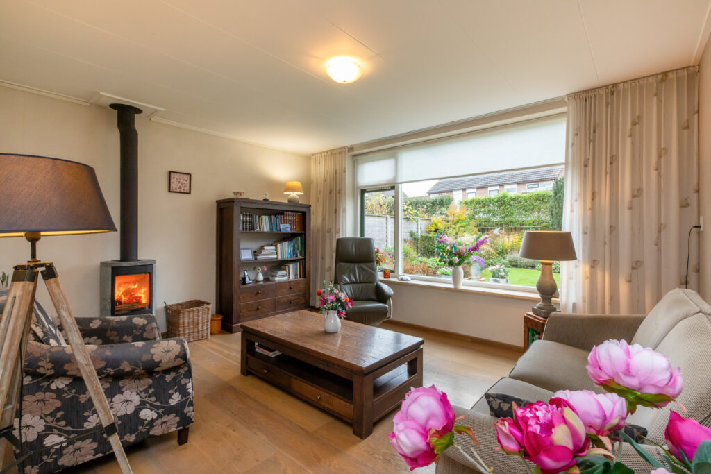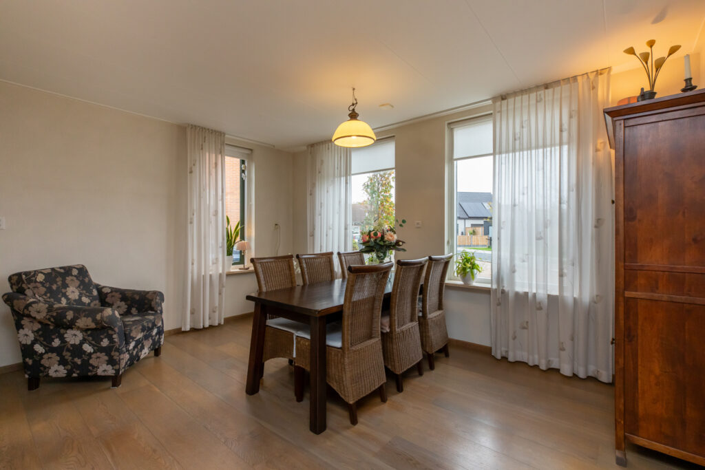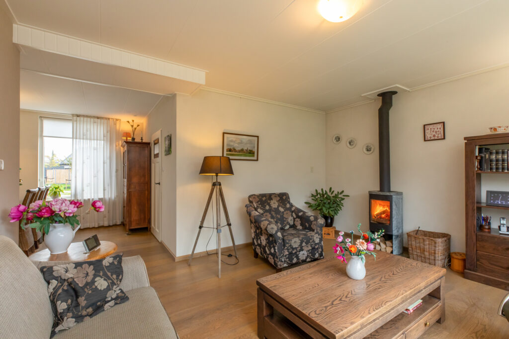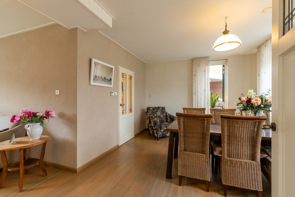 De lichte woonkamer is ingedeeld in een zitkamer en eetkamer. In totaal meten deze ruimtes gezamenlijk zo een 35m². Het zitgedeelte geeft een leuk uitzicht op de achtertuin en de houtkachel (ter overname) zorgt voor de juiste sfeer. Het eetgedeelte geeft juist weer een goed overzicht richting de straat aan de voorzijde.