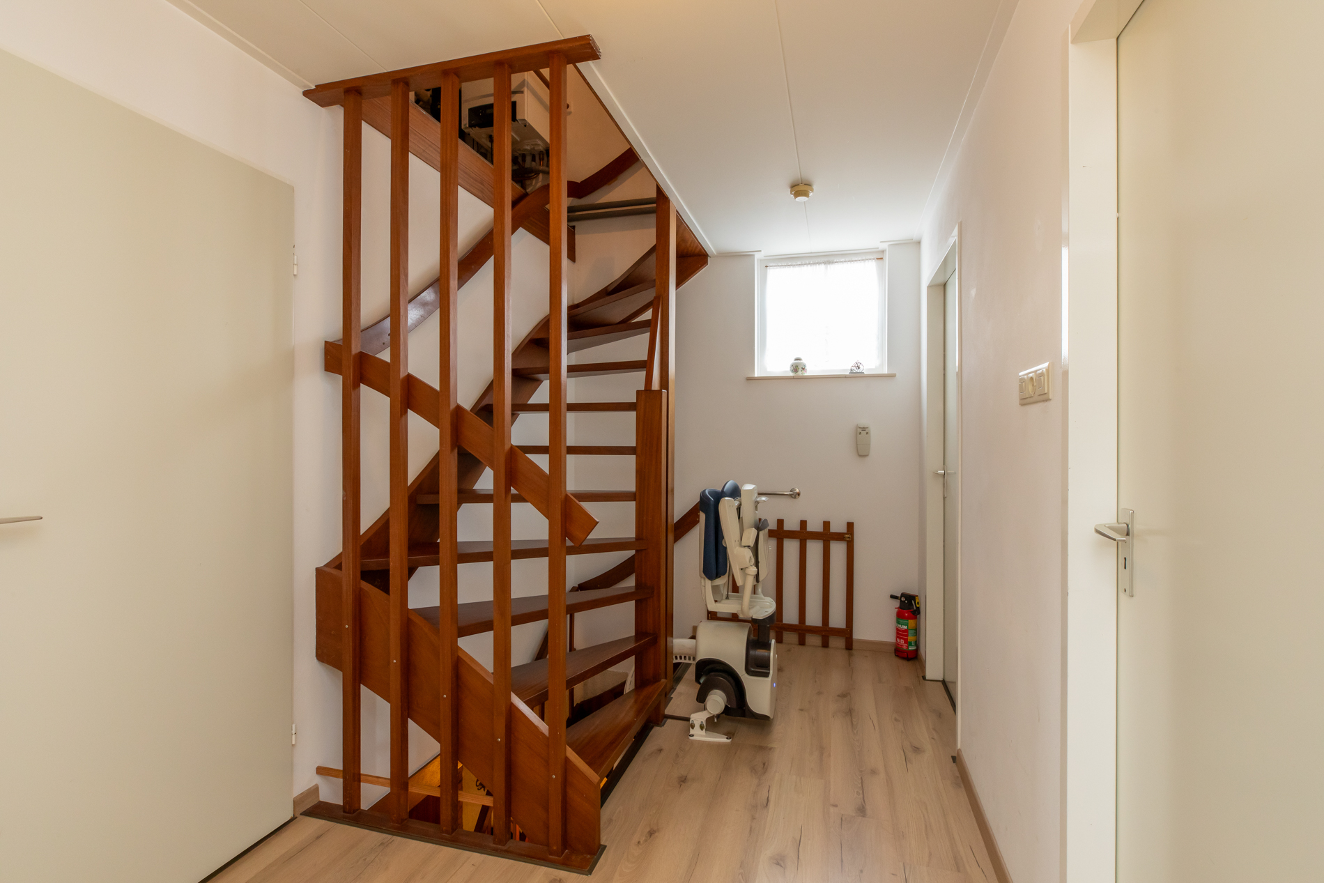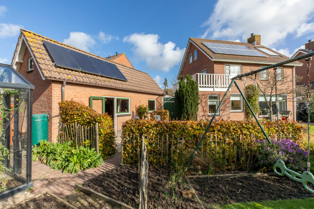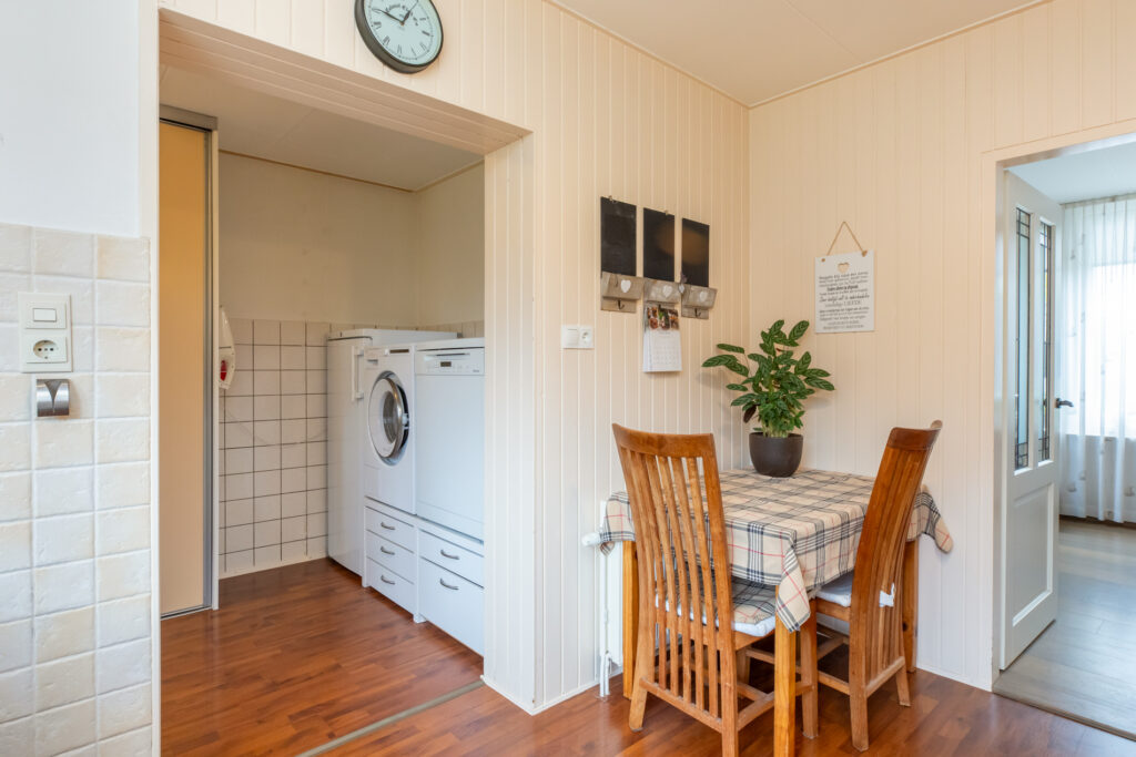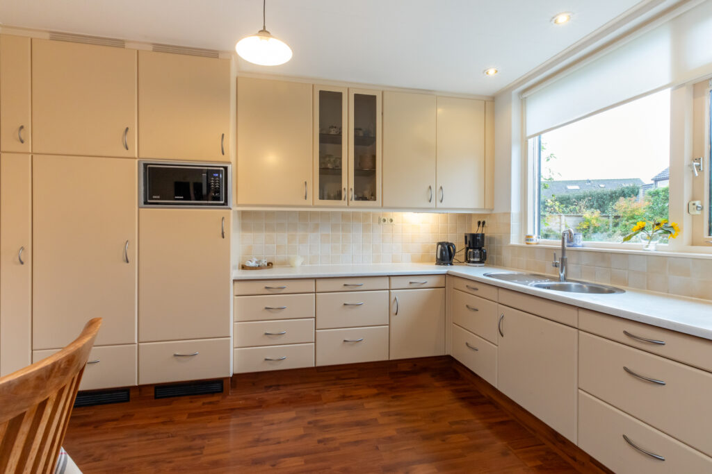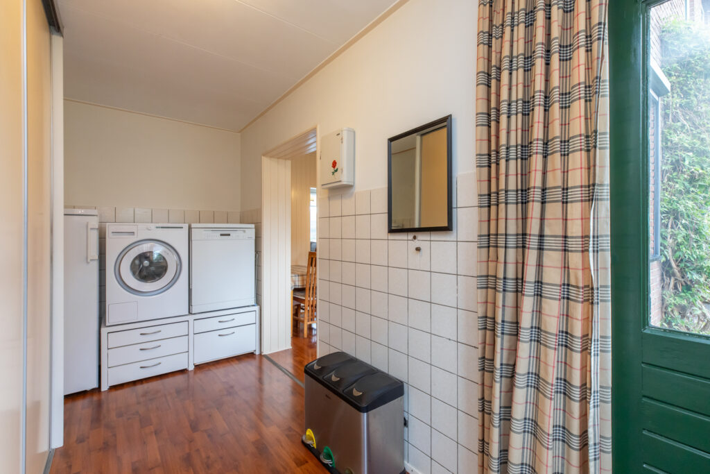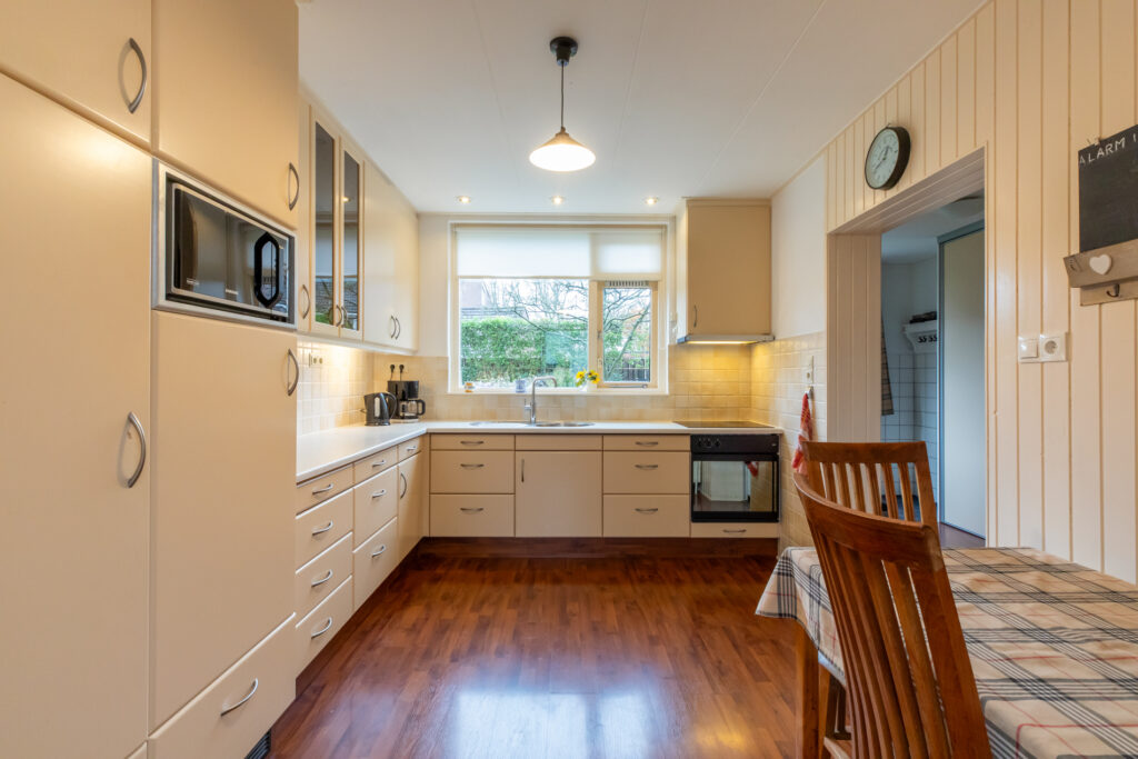 De keuken ruimte is eveneens ruim van opzet en voorzien van een koelkast, oven en inductie kookplaat. Aansluitend aan de keuken is er een handige en praktische bijkeuken. Deze is voorzien van witgoedaansluiting, inbouwkast en deur naar de tuin. De hal en het toilet maken de begane grond compleet.