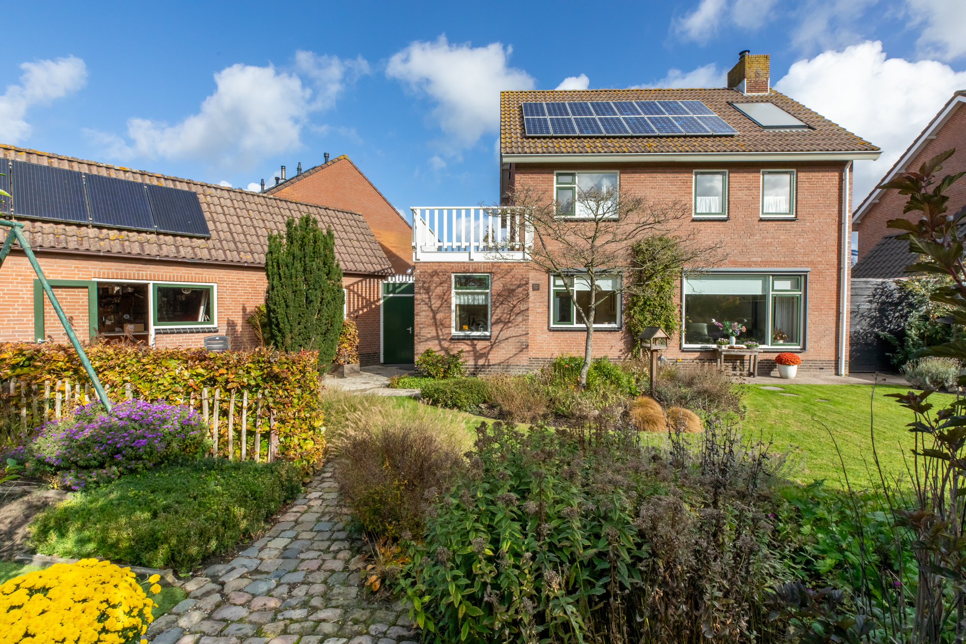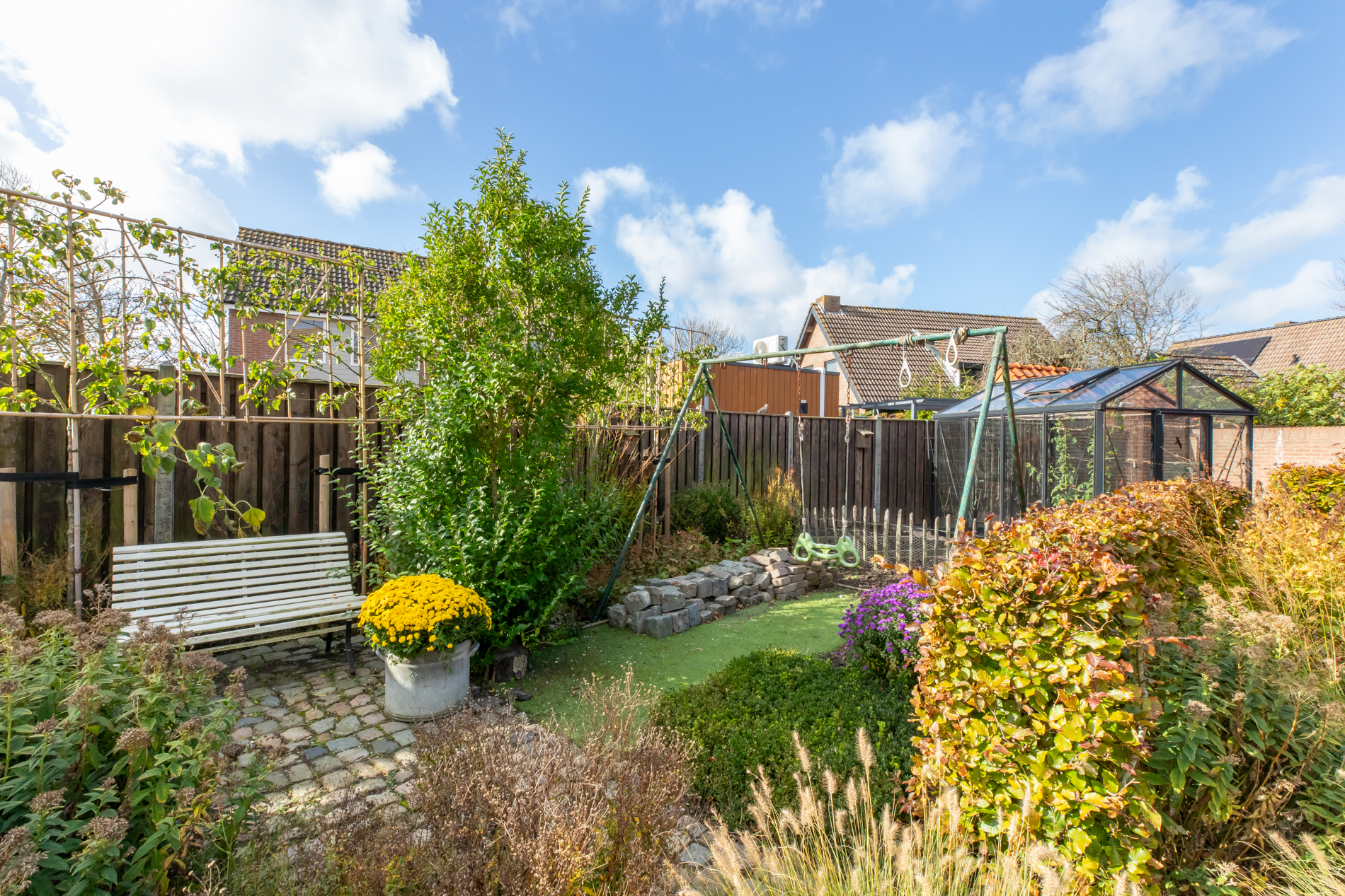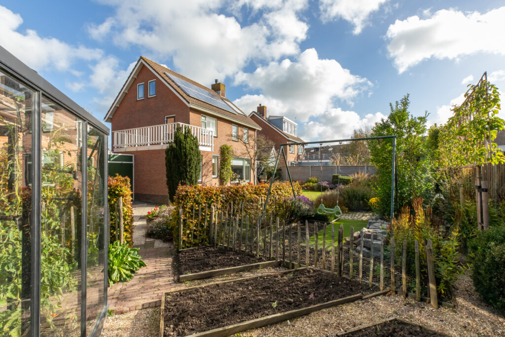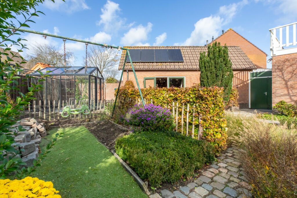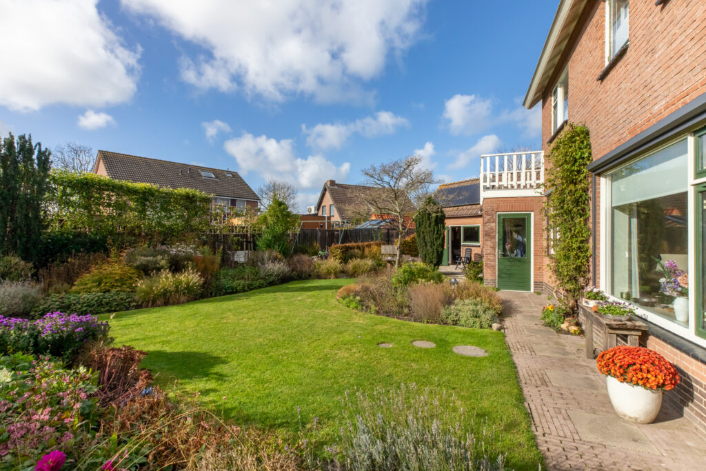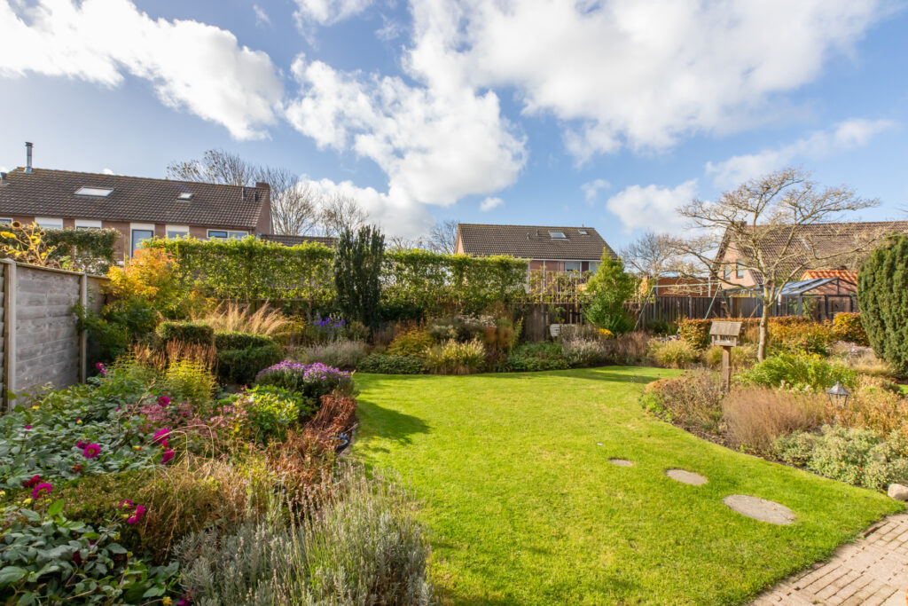 De tuin is een oase en zeer kleurrijk. Het aanwezige groen zorgt voor sfeer en privacy. Borders, gras en terras wisselen elkaar af. Door de situering op het zuidwesten is er een optimale zonligging. Je kunt hier heel lang van de zon genieten.