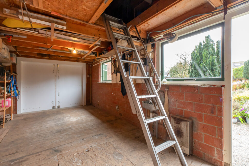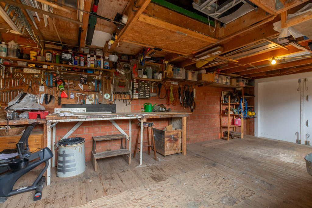 De garage is met zo een 25m² en een zolder ruim bemeten. Deze kan door de aanwezigheid van elektra, krachtstroom en water prima dienst doen als klusruimte. Ook is er al een voorbereiding voor riolering. Uiteraard kan er ook een auto geparkeerd worden. Maar het is misschien veel logischer om dat de doen onder de carport, voor de garage. Een tweede auto kan er op de oprit ook nog wel bij. Aan de andere zijde van de woning is er een berging die dienst doet als hout hok, ideaal voor de houtvoorraad.